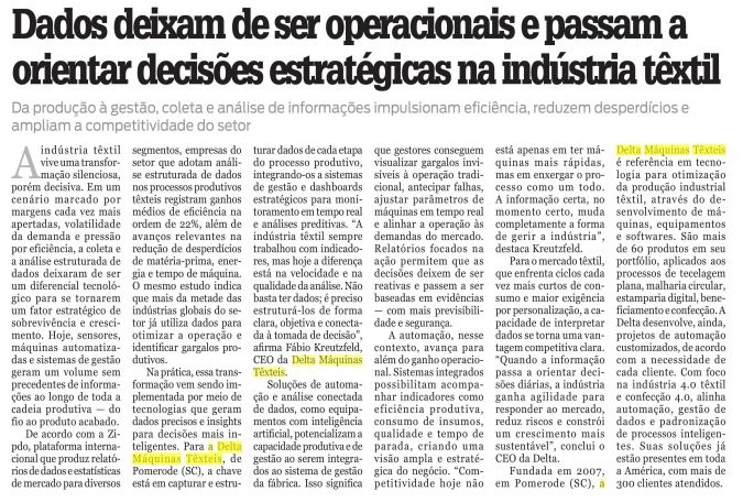 inteligentes. Para a DeltaMáquinas Têxteis, dePomerode (SC), a chaveestá em capturar e estrut